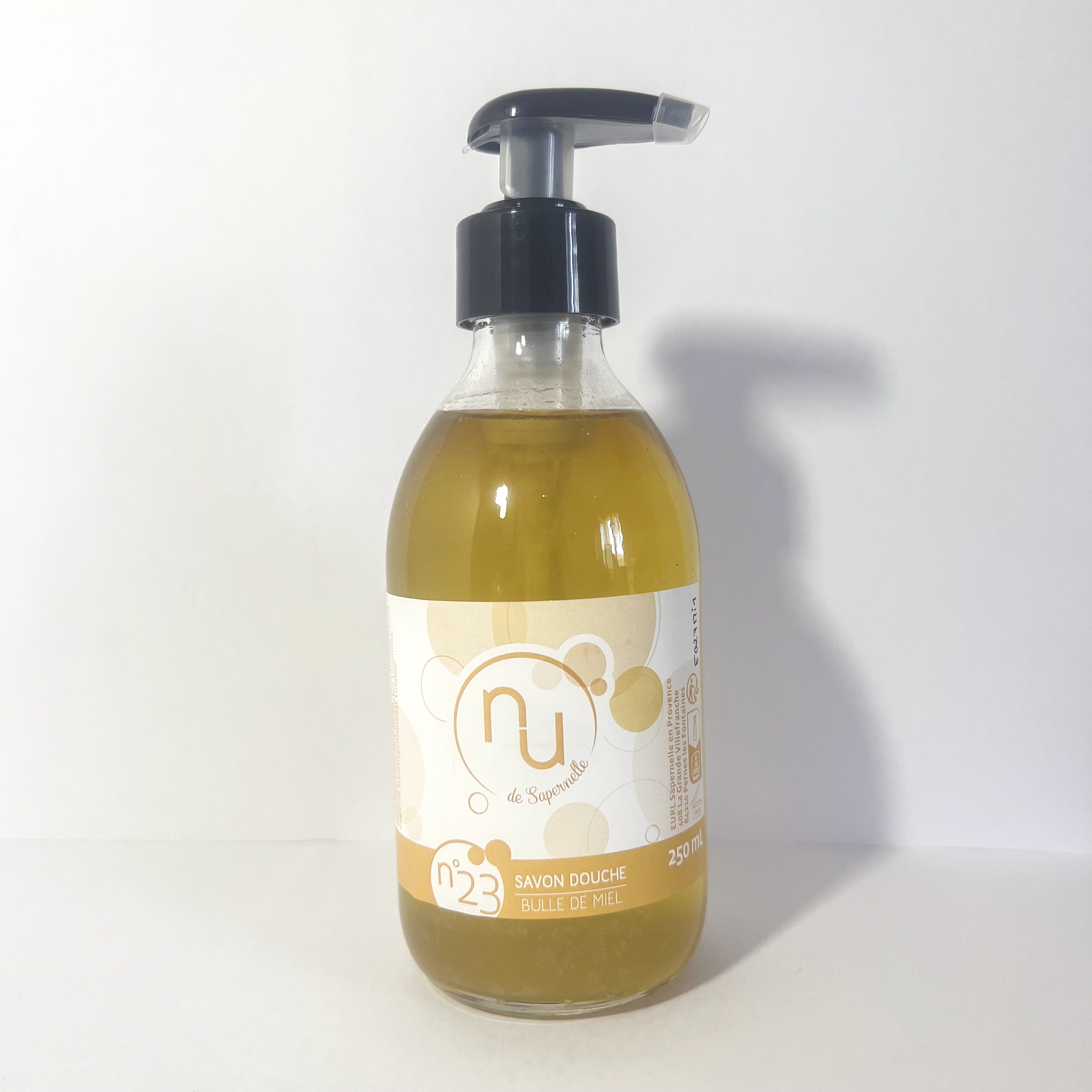 Caractéristiques : Flacon verre (250ml / 500ml) ou plastique (1L), avec ou sans pompe de distribution, étiquette en papier recyclé et recyclable. En termes de durée d’utilisation, un savon douche de 250mL équivaut à un savon solide de 100g.