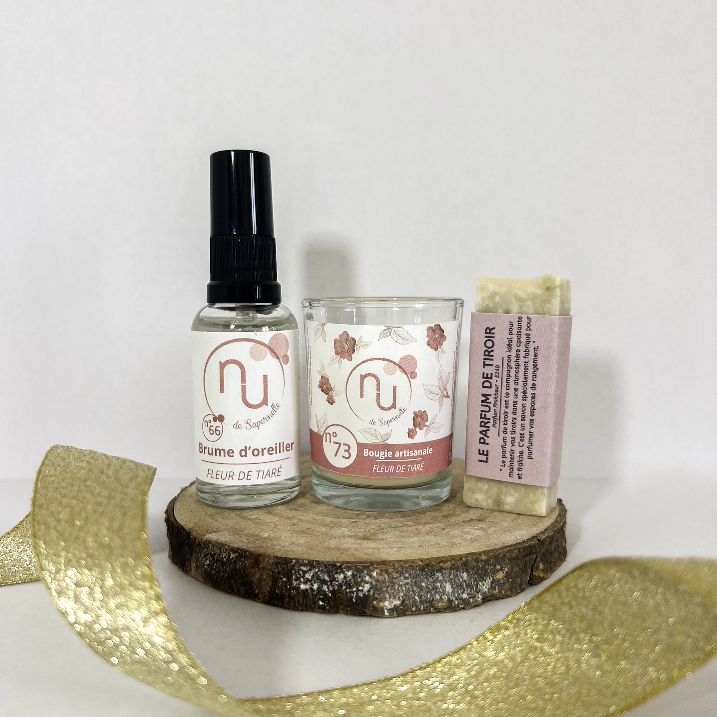 Une bougie d’oreiller parfumée vanille, fleur de tiaré ou fleur d’oranger, pour une ambiance chaleureuse et réconfortante.